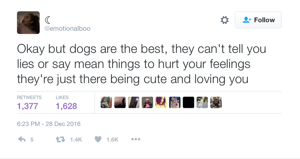 It's no secret that dogs are a gift to us all. They're loyal, loving, and just plain old goofballs. If you've ever met a dog lover, you'll also know that we are downright vocal about how wonderful our furry friends are. Here are some of the best tweets from 2016 about dogs.