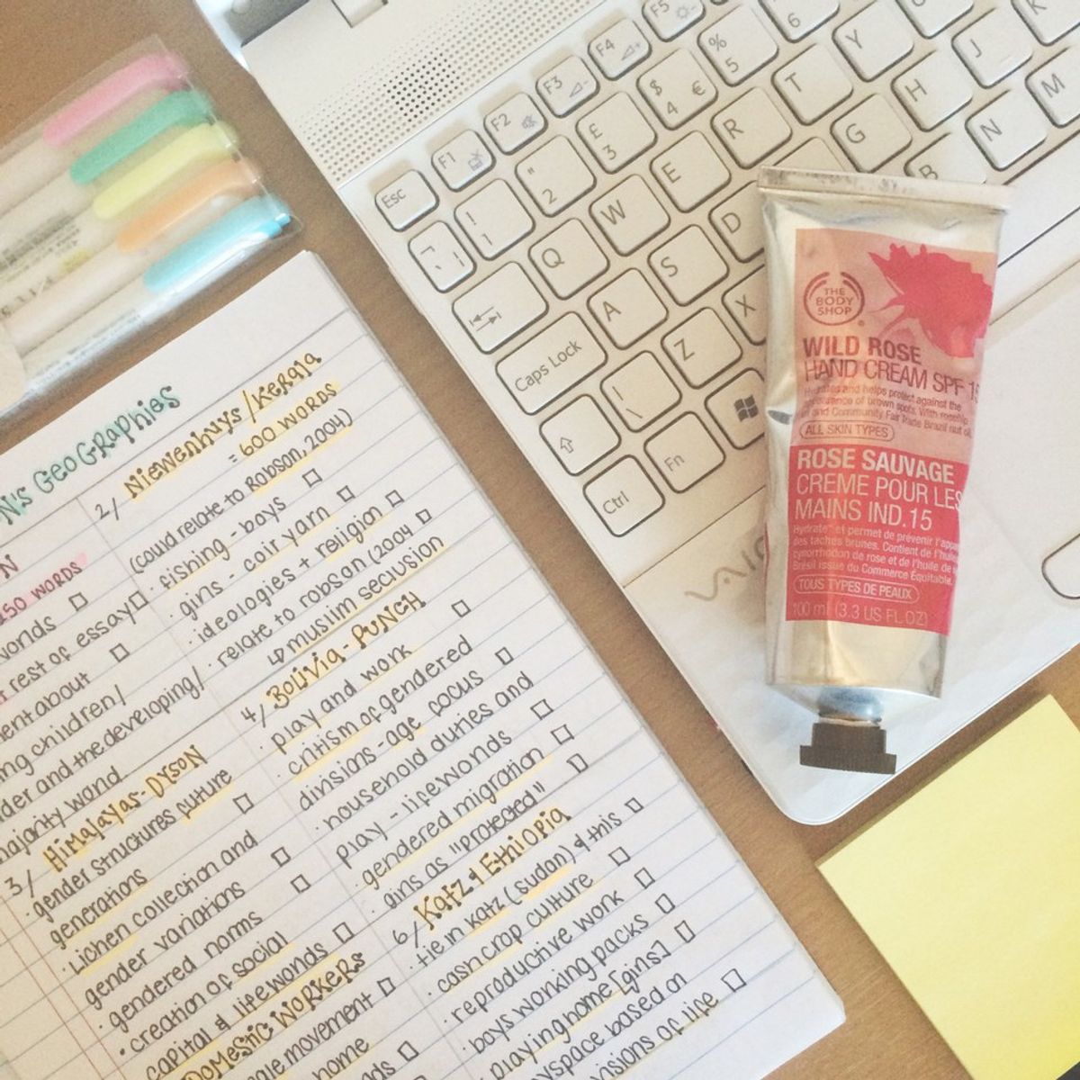 These include the basics: notebooks, textbooks, pencils, pens and erasers. Throw in notecards, highlighters and multicolor sticky notes for the important sections. If I get to class early, I will pull out my notecards and study them if I have a quiz coming up. For visual learners and OCD students like myself, gel pens, tabs and highlighters are key.