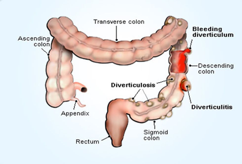 Diverticula are small, bulging pouches that can form in the lining of your digestive system. They are found most often in the lower part of the large intestine (colon). Sometimes, one or more of the pouches become inflamed or infected. That condition is known as diverticulitis.