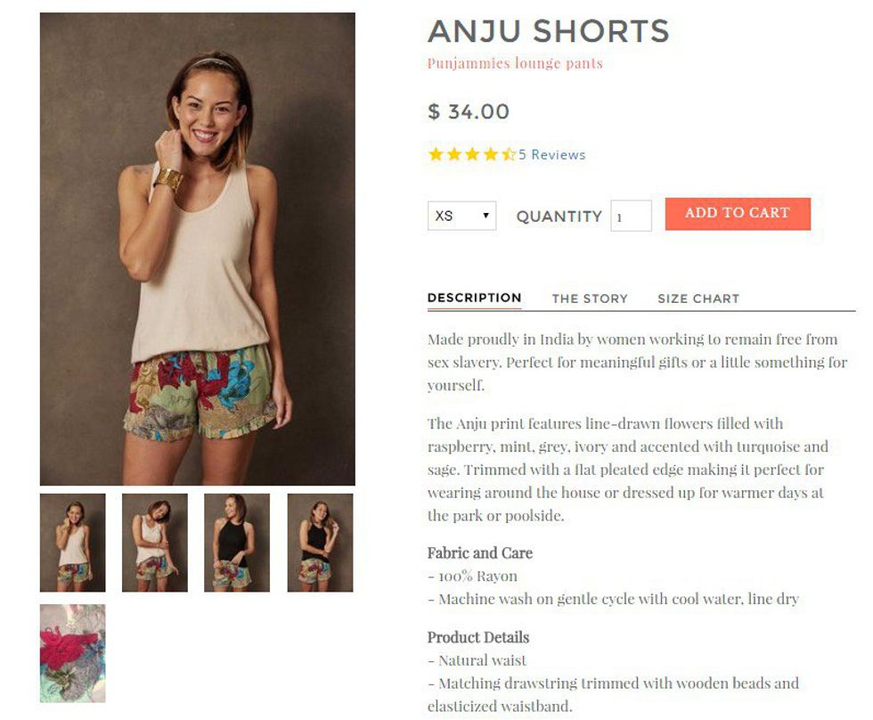 Sudara's mission is to give women training and jobs, as well as housing and education for both the women and their children; according to Sudara, “both are essential to creating a pathway for women to escape from sexual slavery and live in freedom." Products sold by Sudara include tops, shorts, robes, temporary tattoos and “PUNJAMMIES" (lounge pants). Their website can be found here.