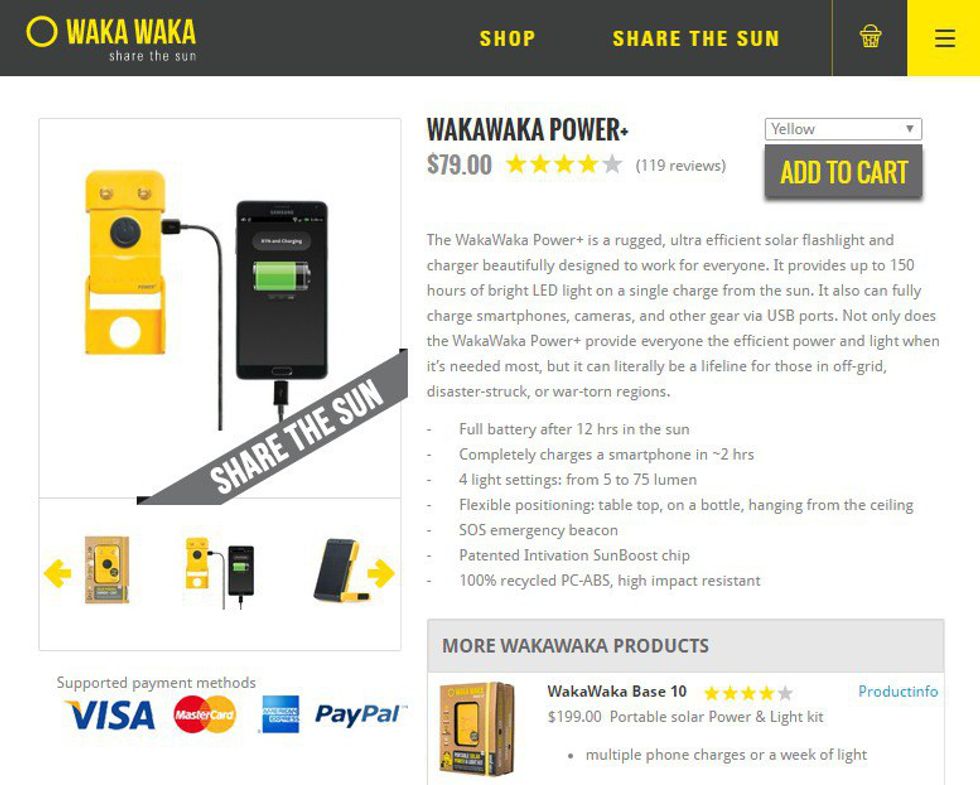 With the slogan “share the sun," WakaWaka sells solar-powered LED flashlights and portable chargers, as well as waterproof pouches. With every purchase, WakaWaka gives a second flashlight or charger “to send to someone living through a humanitarian crisis." Those benefited include survivors of natural disasters in Haiti, Nepal and the Philippines, as well as “families displaced by war and strife." Their website can be found here.