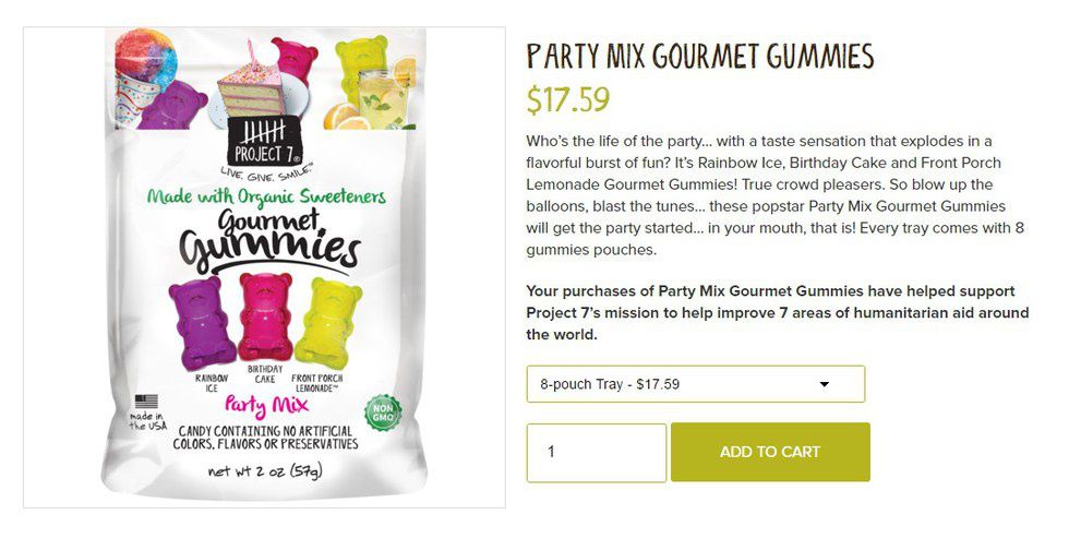 Project 7 makes organic gummy bears, gum and snack clusters; sugar-free alternatives are also available. This company uses profits to give back to seven areas of need by taking action: helping to plant trees, providing emergency relief as a result of natural disaster, providing meals in U.S. communities, giving clean drinking water to those in need, delivering malaria treatments to those in need, providing daily school education in developing nations and putting students through anti-bullying programs. Their website can be found here.