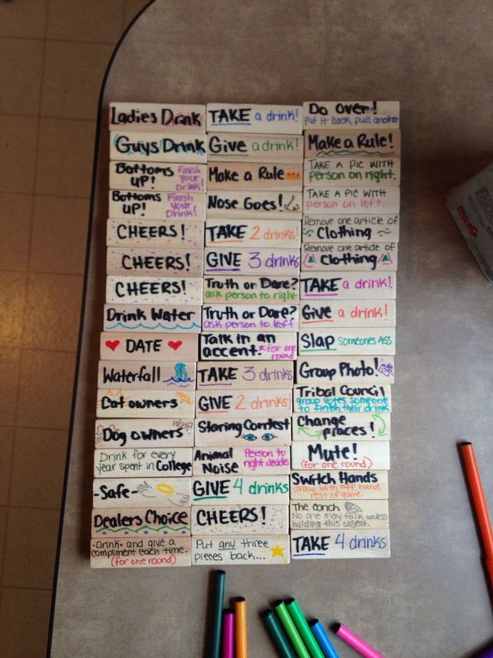 Jenga is originally a childhood game, but with a few sharpies this game can turn into a bunch of drunk fun! Which ever block you pull out of the stack, you must complete what it says to do.