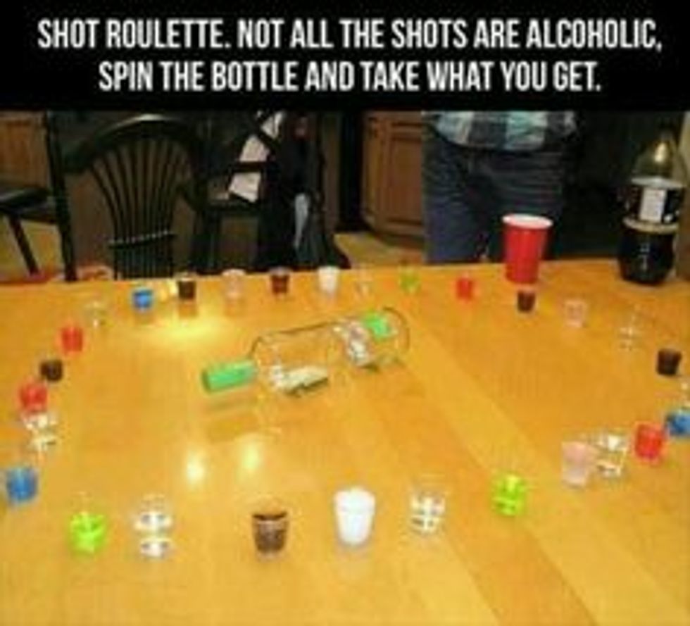 The best way to play this game is to fill x amount of shot glasses (or cups) with vodka, y amount of shot glasses with vodka, z amount with Malibu and the rest with water. You don't have to set it up this way specifically, but it's just to give you the overall idea of the game. Once all the cups are set up, using an empty bottle of any kind, spin the bottle and which ever shot glass the bottle lands on you have to drink. The fun of this game is you don't know what you are going to be taking a shot of!