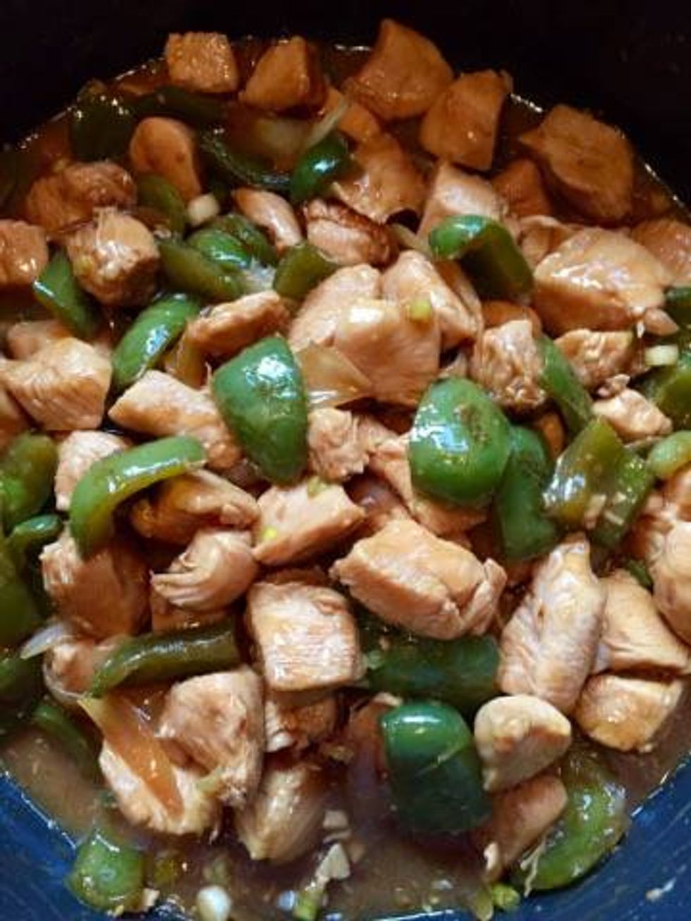 This meal can be served over white rice. The basic ingredients that you will need are chicken, teriyaki sauce, and peppers. The sauce is really what does the trick and you are pretty much set with flavor. Click here for a detailed recipe.