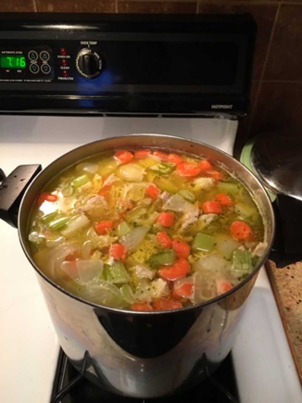 Chicken broth, fresh carrots, celery, and egg noodles. You can even throw in some boiled chicken. This meal is seriously so easy, once you make it once you will crave it all the time. You can really throw in any preferred vegetables that you like, and you will have a meal for days. Here is the recipe.