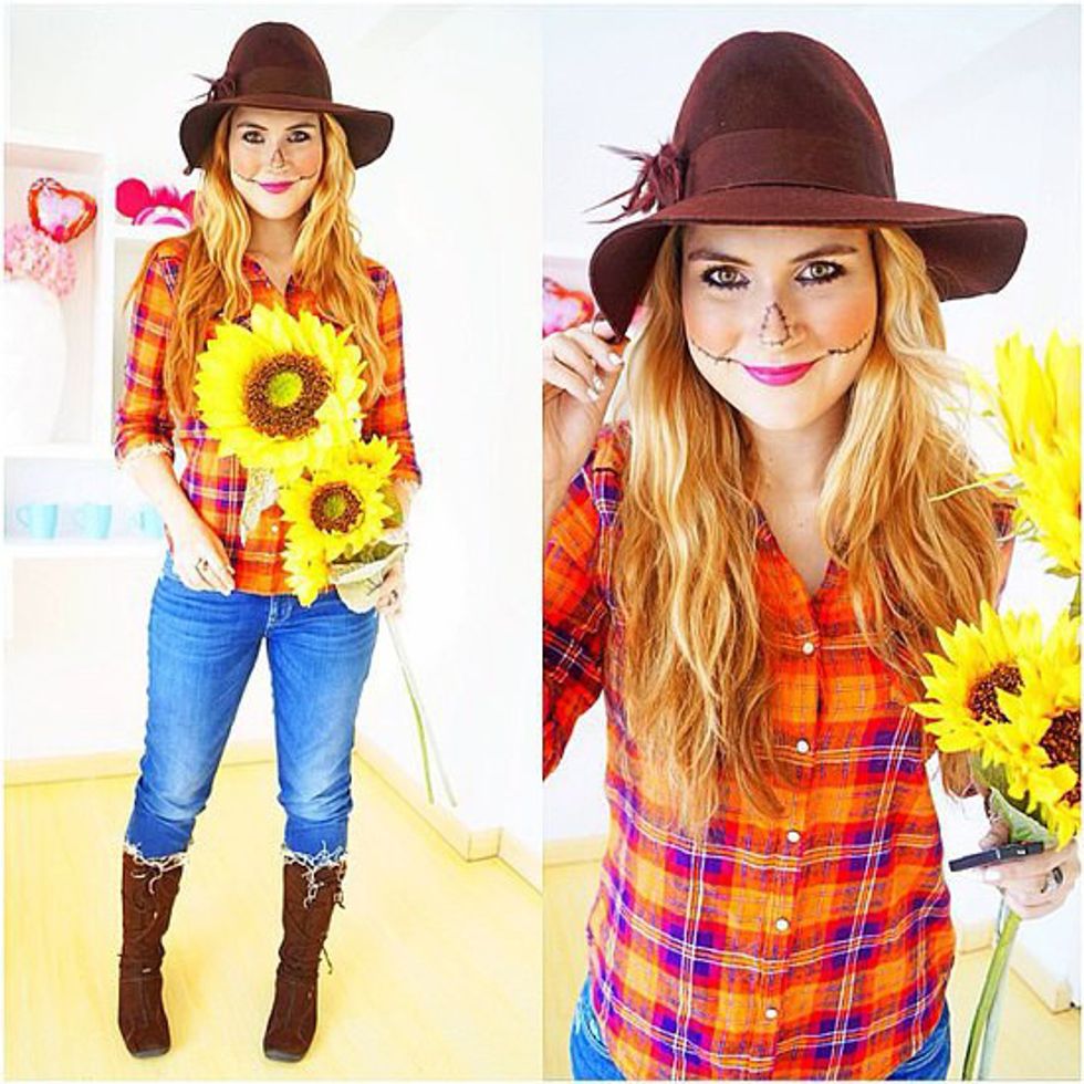 Odds are you or someone you know owns a flannel in any color scheme. Pair that with a pair of your favorite jeans and some boots and your outfit is complete. The hat is optional, but it does add a nice touch. And then, for the face detailing, find either a liquid or pencil eyeliner and draw the lines going out from the corners of your mouth and then draw the lines on your nose as well. Add a nice, bright blush onto your cheeks where the lines end and in the center of the lines on your nose and you're good - the scarecrow transformation is complete!