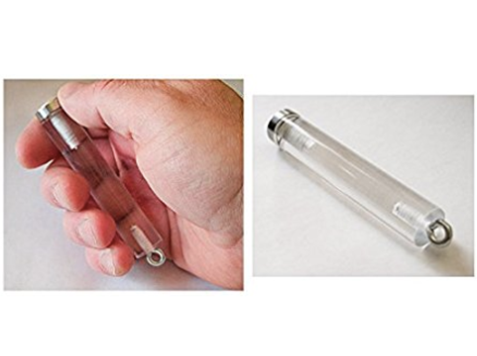 This roller toy is made of an acrylic tube with an eye screw so it can be attached to keychains and such. The top is flat and can be rolled around like you're screwing in a screw. It's tiny and fits in your hand easily and makes no noise. Amazon.com | $13.95