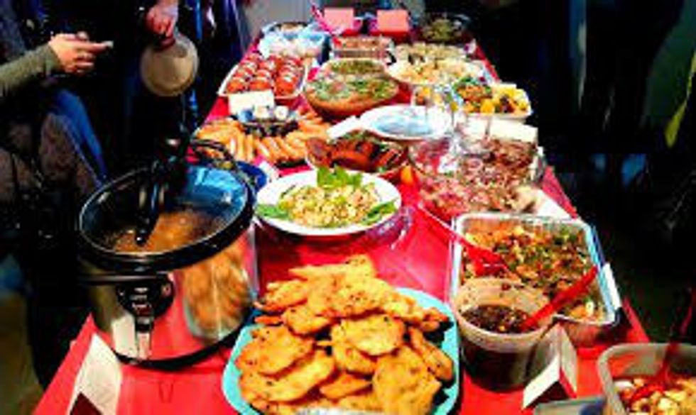 Invite friends for a potluck. Have everyone bring a meal or drink and plan to watch a movie or play a game, rather than go out.