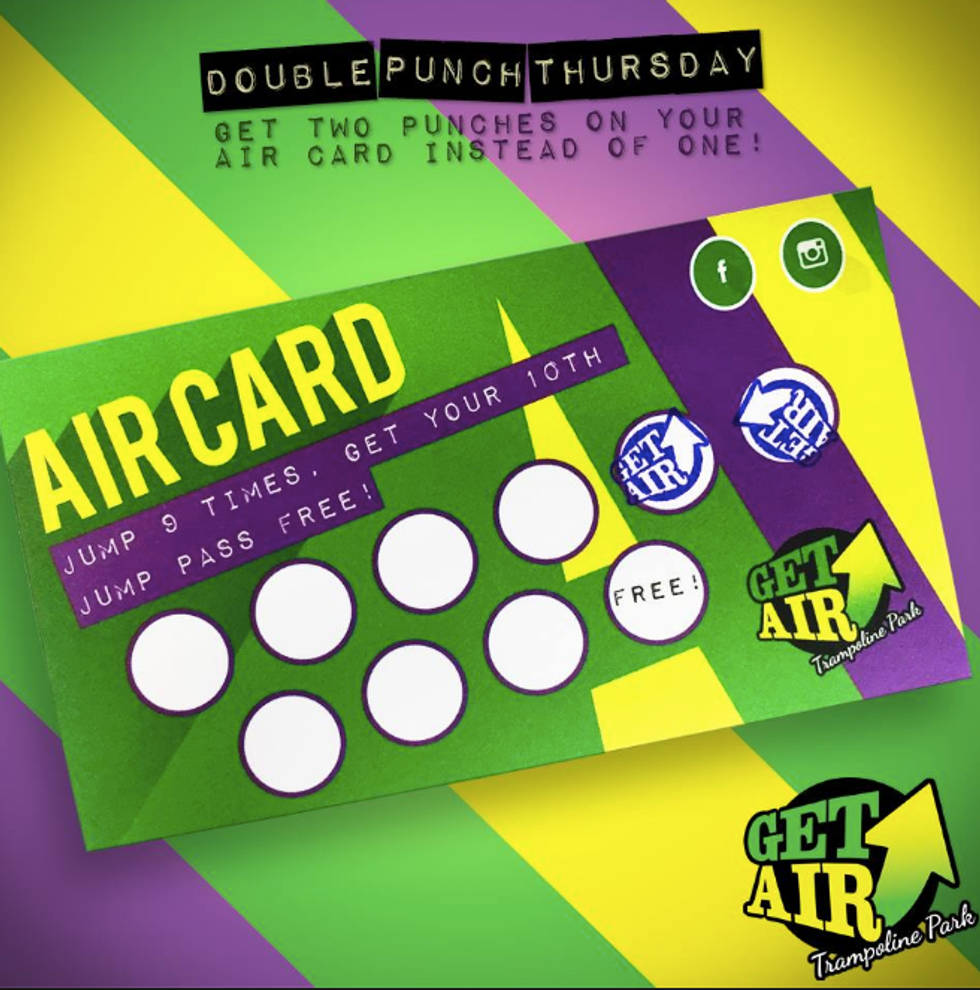 The punch card is a great way to save money and can be found right by the front desk... for free! The way the punch card works is quite simple; get your card punched nine times, and the tenth punch is a free jump! This is a great way to accumulate free jumps all summer, be sure to come on double punch Thursdays! The whole family can join in, not to mention college students on a tight budget!