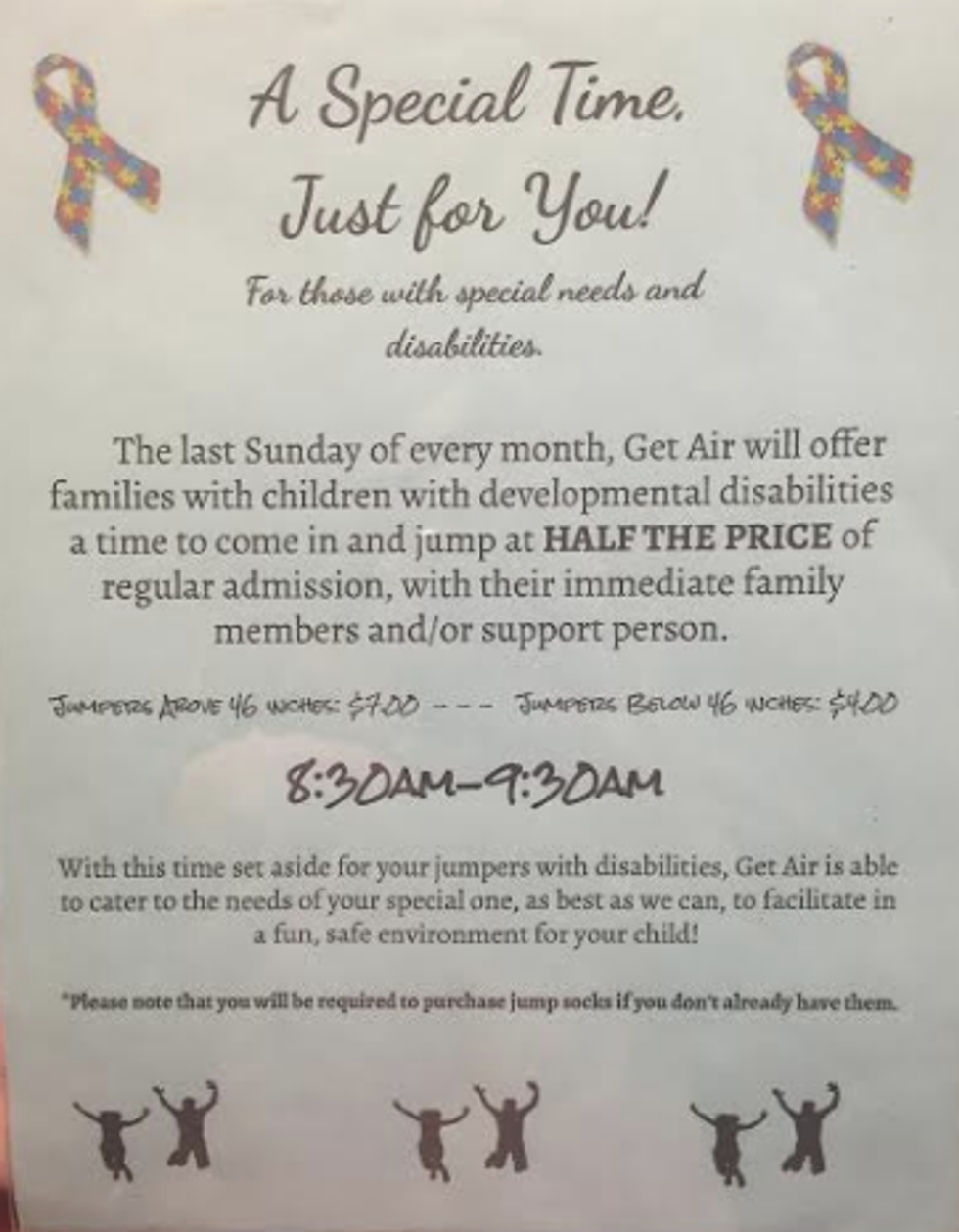 Every last Sunday of the month from 8:30 to 9:30 Get Air Portland offers an event where families with children with developmental disabilities can jump for half the price of what everyone else pays! This includes immediate family members and/or their support person. This allows Get Air to cater to the needs of every jumper. Get Air Portland does a fantastic job in supporting your loved ones in every way they need, so jump on over!