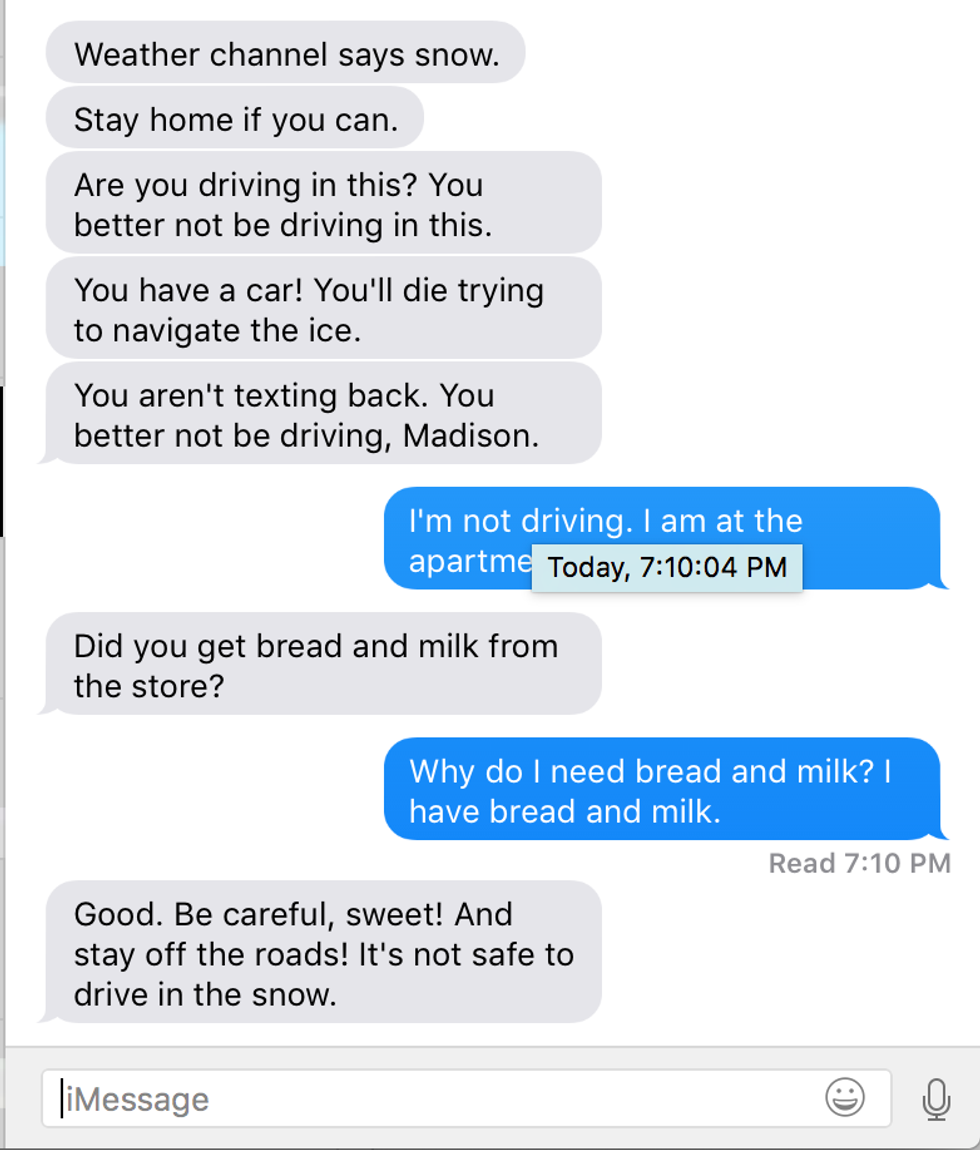 What can you even make with just bread and milk? Does no one understand that if the power goes out because of a winter storm, the milk will just go bad anyway? Is the South the only geographical location with an obsession with these two grocery items?