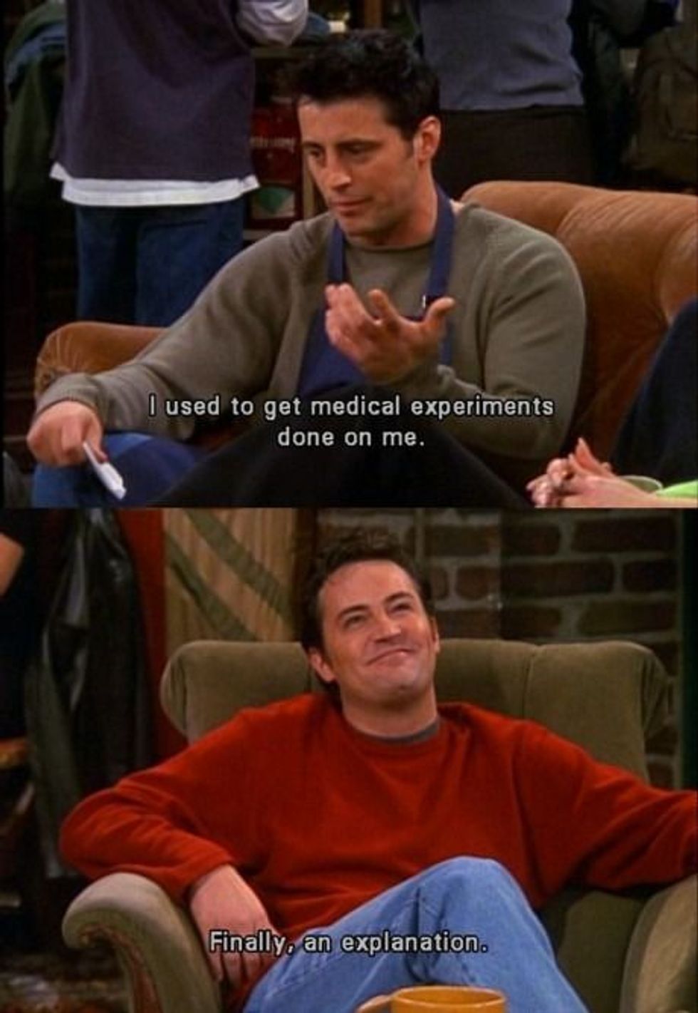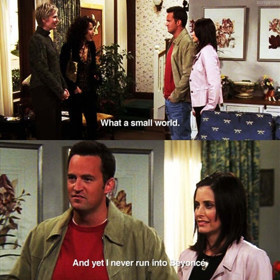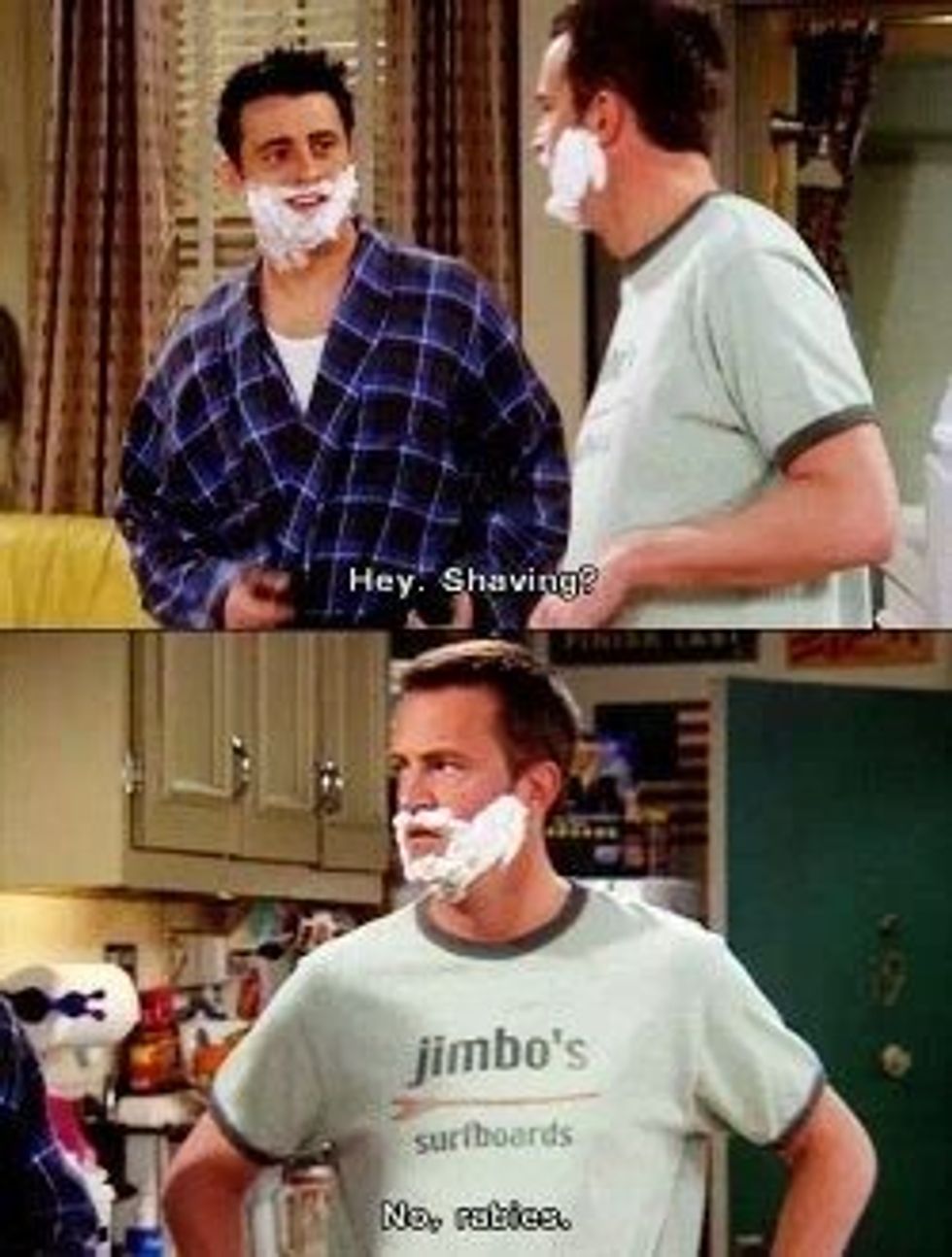 Friends was the heartwarming TV show in the 1990s about finding family in friendship. Despite all of the huge life events that occurred throughout the series, the best moments were the mundane, which were made infinitely more interesting by each of the characters. Arguably the best part of watching these trivial problems unfold was Chandler Bing's snarky commentary on everything. With each downfall, Chandler was there to provide a sarcastic comment and therefore comedic relief. Below are a few of my personal favorites!