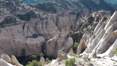 Situated on the Pajarito Plateau 40 miles southwest of Santa Fe, New Mexico, this national monument has a trail that leads up to 6,760 feet above sea level. Rock formations were caused by Jemez volcanic eruptions, which then created the tent rocks due to pumice, ash, and tuff deposits. In the Pueblo language of Keresan, Kasha-Katuwe means "white cliffs".