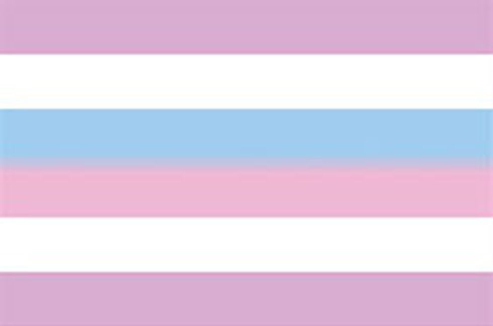 Gender identities are just as diverse as sexual orientations. Transgender people are people whose gender does not necessarily fall in line with their biological sex. That is to say, someone who is born male may not feel that calling oneself a man is the best way to describe who they are as a person; the same can go for someone who is born female or intersex (we'll get to that in a bit). Someone born female may feel that they prefer to be referred to as a man. Someone born male may feel that they don't mind being referred to as either a man or a woman. And someone may feel that neither term really fits. Identities can range from having no gender, to multiple genders, to having a gender that falls outside of the typical gender binary of man/woman, to anything in between. The colors of the flag are blue (the traditional color for boys), pink (the traditional color for girls) and white (to represent those who are intersex, transitioning, or have a gender that is undefined).