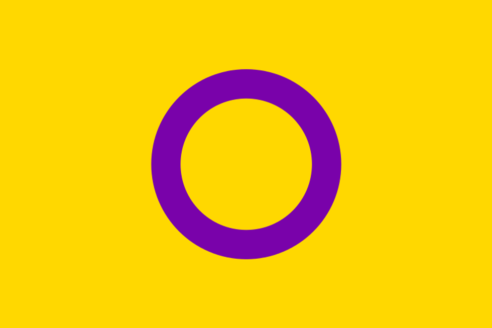Intersex people are people who are have a mix of characteristics (whether sexual, physical, strictly genetic or some combination thereof) that would classify them as both a male and a female. This can include but is not limited to having both XX and XY chromosomes, having neither, being born with genitalia that does not fit within the usual guidelines for determining sex and appearing as one sex on the outside but another internally. It is possible for intersex people to display the characteristics from birth, but many can go years without realizing it until examining themselves further later in life. Here is an older version of the intersex flag which utilizes purple, white, blue and pink (left) and a more recent one that puts an emphasis on more gender-neutral colors, purple and yellow (right).