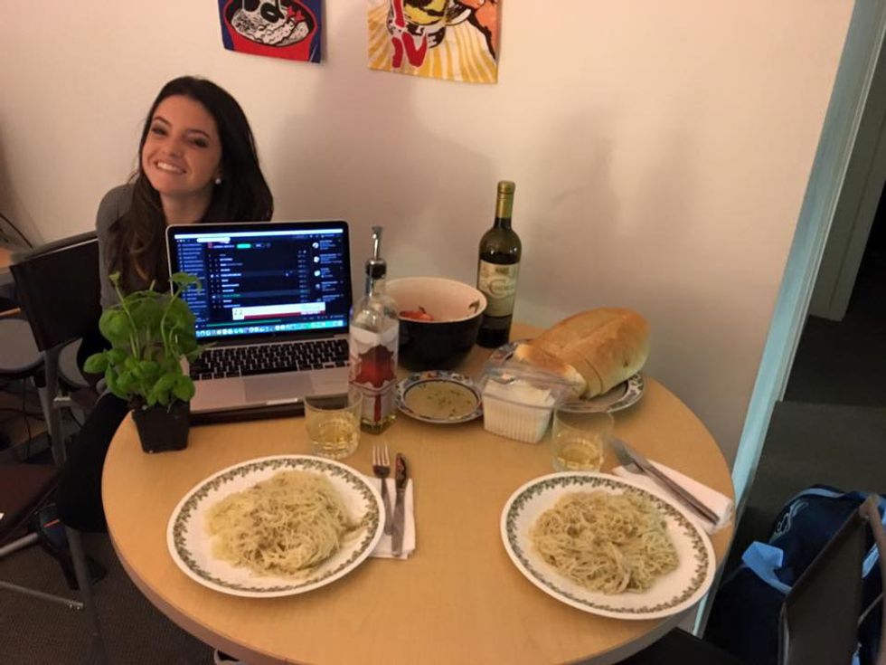 It's the first time you're cooking linguini with clams, so you call your mother and his father on the phone to get the best tips. You then go to the store together to pick up the items, and you start cooking together, and it's beyond romantic. You get dressed up for the occasion to impress and you're playing Andrea Bocelli's, "Mille lune, mille onde," like from the Barilla commercials 'cause you're a friggin' pasta goddess! You both are taking glimpses at each other out of the corner of your eyes, smirking as you make your angel hair al dente. You tell him to chop the garlic like how your mother used to, almost in a pissed off way, and he tells you he loves how you stand there with one hand on your hip and the other hand stirring the gravy.