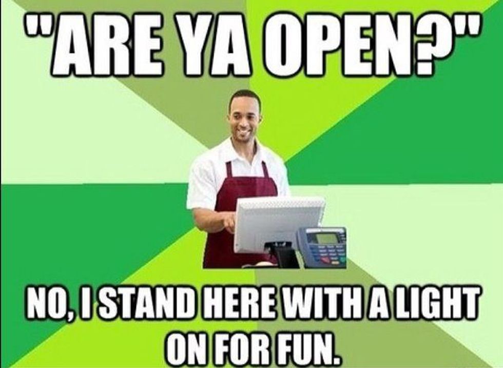 Often, we are open when you ask this question. I don't know how many times a day we get asked this. If our light is on and our closed sign is not out, we are open indeed. But either way, we do get paid to stand there.