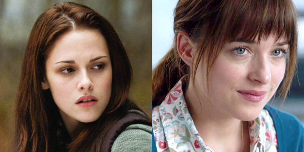 In the Twilight series, the heroine is Bella Swan. Bella is a very quiet, intelligent girl who mostly keeps to herself and does not have very many friends. She's is pretty, but plain. Anastasia Steele is very similar. She is described as very smart and shy, and she avoids ever sharing anything personal about herself. Ana is also considered beautiful in an unconventional way.