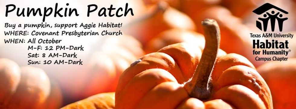 Aggieland's Habitat for Humanity is hosting their annual "Habitat Pumpkin Patch" that helps provide money for those in poverty. The pumpkin patch is available Monday-Wednesday 12 p.m.-sundown, Saturday 8 a.m.-sundown & Sunday 10 a.m.-sundown starting September 27 through the first week in November. Go get yourself a pumpkin and throw a carving party while you drink pumpkin spice lattes while pumpkin scented candles are lit, because it's October and YOU CAN.