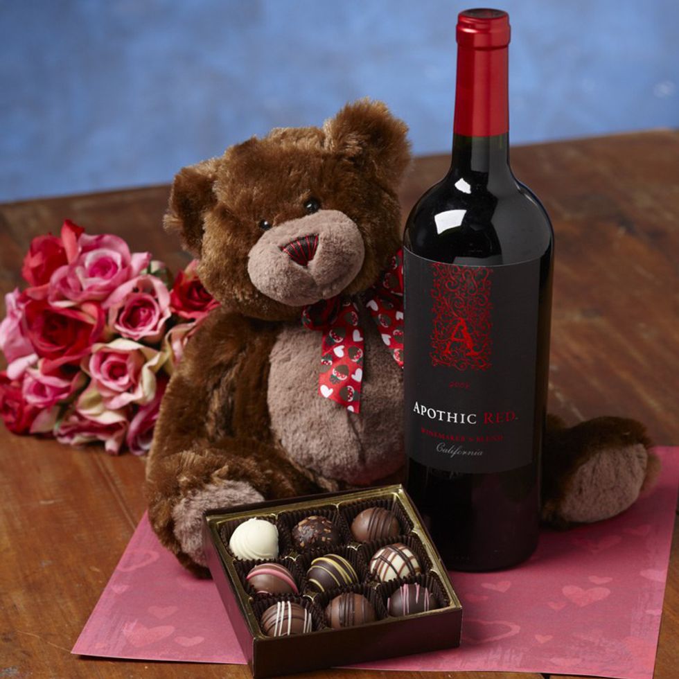 Give the gift of a teddy bear because what else would they cuddle with when you are not there? A movie and wine is a nice way to just hang out together for the night.