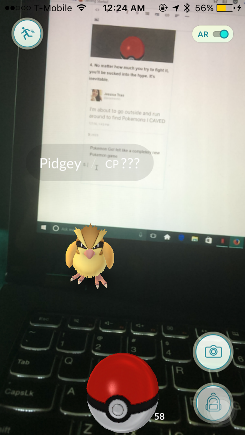 As my boyfriend and I were finishing up dinner, I opened my Pokemon Go! app to check for anything and a Weedle appeared just two feet away from our table. On a completely different occasion, I found a Pidgey just hanging out on the keyboard of my laptop. Much to my dismay, there aren't a whole lot of Pokemon to be found and caught while walking around in my neighborhood *cries hysterically*. But as far-fetched as it would be to find these Pokemon in these places (no pun intended), it's fun to open up your camera and find one in the oddest of places. Hot tip: if you EVER need a Magikarp, there's always a few of them around the perimeter of my job.