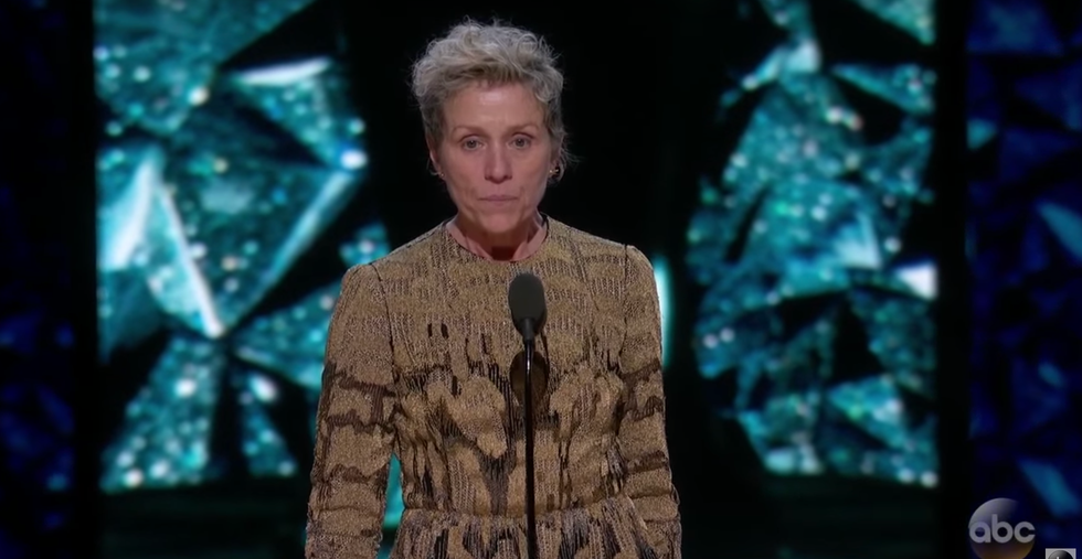 Francis McDormand won her second Oscar for her performance in "3 Billboards Outside Ebbing, Missouri." She gave a shout-out to Chloe Kim's halfpipe run at the Winter Olympics this year, which gathered a round of applause from the audience. Besides taking a moment to thank those who had helped her with her performance, she also summoned all of the other female nominees in every category to stand with her for the remainder of the speech.