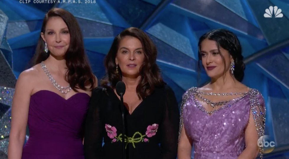While the messages behind #TimesUp and #MeToo were present in many aspects of the 2018 Oscars, there was a #MeToo tribute video that was presented at the ceremony. The video features a montage of activists, actresses, directors, and others highlighting the importance of speaking out and the exposure of misconduct. The video was presented by Ashley Judd, Salma Hayek, and Annabella Sciorra; all three have spoken out publicly against Harvey Weinstein and in support of #MeToo.