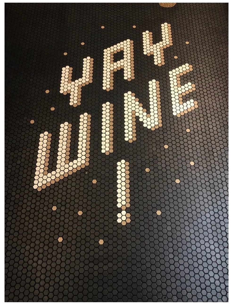 Walking into the gorgeous corner location in Nashville, Tennessee, the floors are a light wood, the ceilings are high and pops of color catch your eye left and right. Black and white tiles pattern the floor perfectly, making shapes and spelling "YAY WINE!". The light fixtures are mixed and matched through the location, made with exposed light bulbs and brushed brass details. Around the floor sits a jungle of tables with small succulents and stations filled with salad, sandwiches, chips, sweets, cheese and of course, wine.