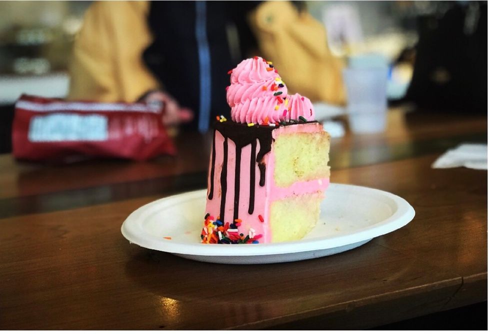 While wandering through all the food stations you come across fresh meats and vegetables, a large selection of cheeses and caviar. They use locally sourced produce and make each dish with the freshest ingredients available. I had the small plate of Harissa spiced smoked chicken wings, made with cilantro yogurt and kombucha pickled onions as well as the pimento BLT made with homemade pimento cheese, applewood smoked bacon, pickled green tomatoes and bib lettuce toasted on sourdough bread. To drink I had a blood orange San Pellegrino from the cooler and a Frosé which is essentially a rosé slushie. For dessert I had the feature cake which was three layers of champagne soaked vanilla cake with champagne infused strawberry frosting, chocolate ganache and sprinkles.