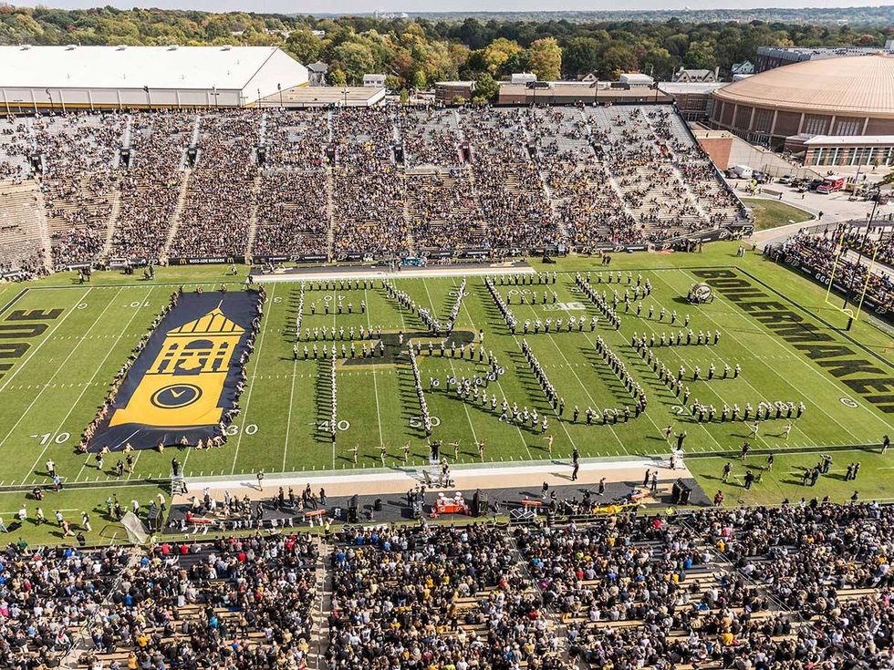 M for Marching Band, members of Purdue's All-American Marching Band perform at amazing football half-time shows and other events. They were the first to break line formations and make shapes like the Block "P."
