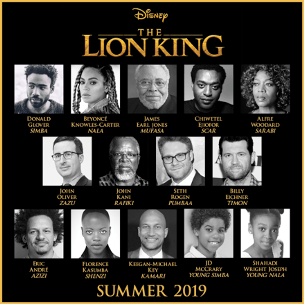 OOOK! This has been released for a while now! But still, wow! Look at this beautiful cast for a beautiful movie we all grew up with. Being a die-hard "Lion King" fan and having the motto Hakuna Matata guide my life, I was a little uneasy about how the live-action would turn out but holy crap, does this look good! And can we please take a second to appreciate the amount of black in this black and white photo. They chose a very influential, powerful, and strong makeup of black actors and actresses.The white people they chose are also excellent and are very socially active in today's society and bring a nice humor to the cast.