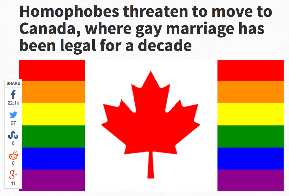 There are many more where those came from. But there’s just one little hiccup with that plan. Same-sex marriage was extended nationwide in Canada in 2005.