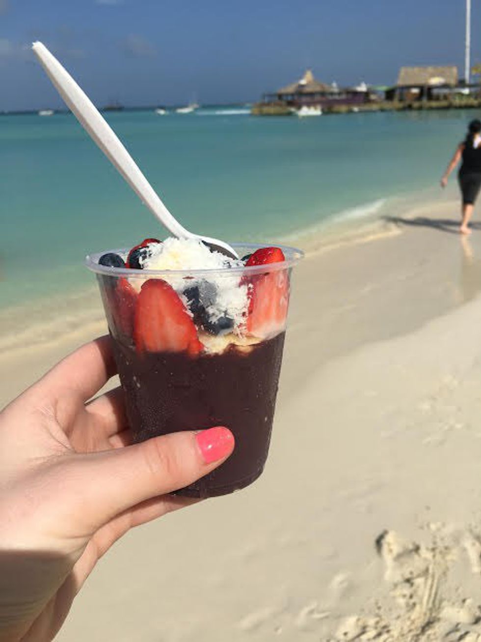 Aside from the health benefits acai brings to the table, it tastes delicious. It tastes like a cross between chocolate and a mix of blackberries, blueberries and strawberries. Speaking of, these are just three of the many other fruits that the base of the acai bowl can be blended with. A lot of places that make acai bowls blend the berry with apple juice, bananas and various other berries. You can even get flax seed or chia seed thrown in the mixture for some extra protein. At home I throw some almond milk and peanut butter in the blender with acai and a banana.