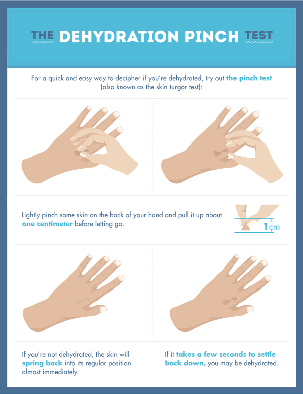 Pinch yourself (I’m not kidding,) and know the signs and symptoms of dehydration.