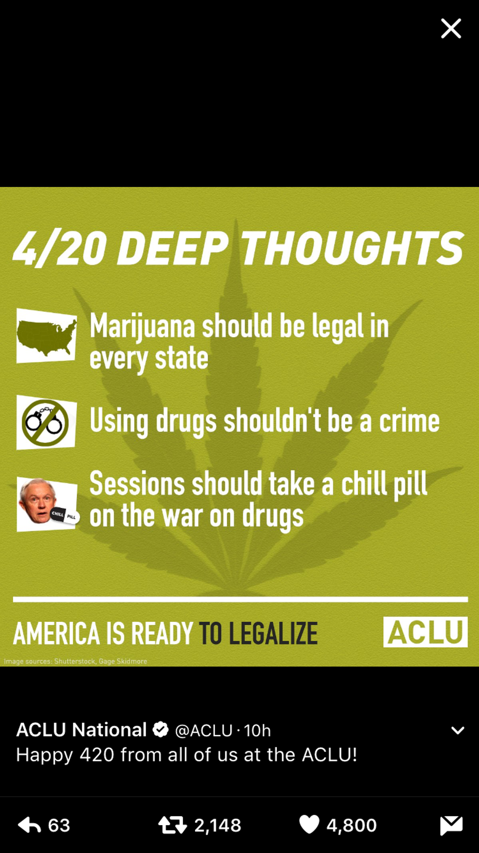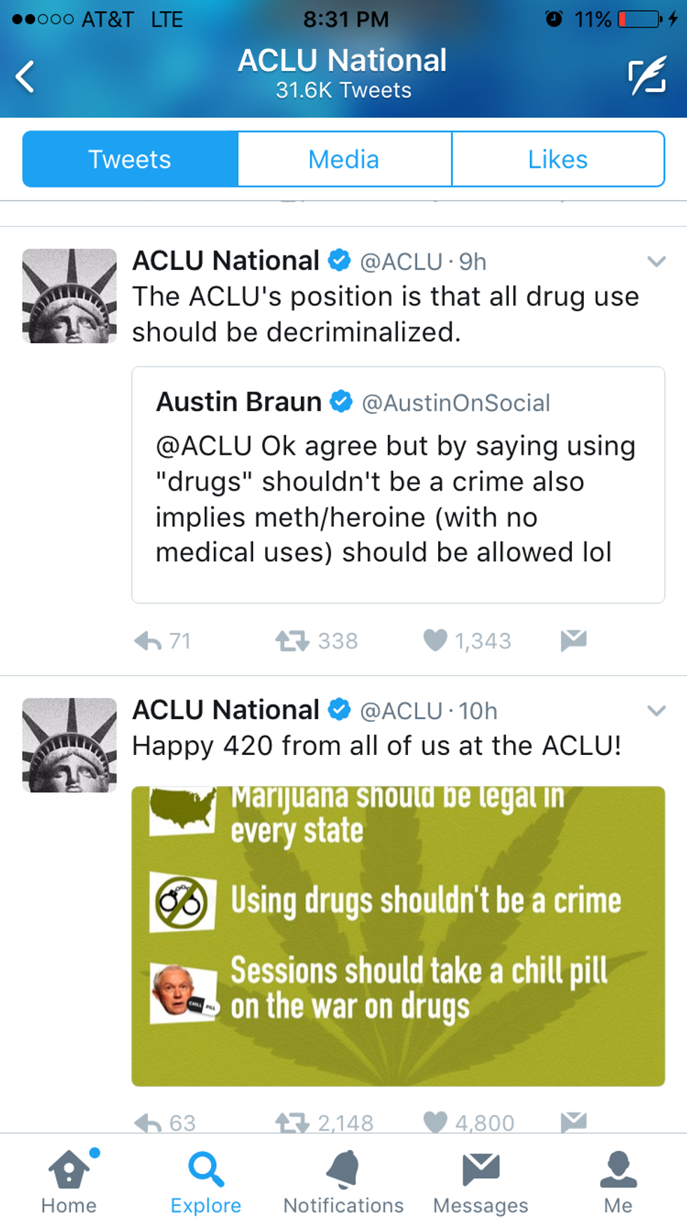 One standout tweet came from the American Civil Liberties Union (ACLU) National account who tweeted a “Happy 420” along with a few of their stances on marijuana and drugs in general.