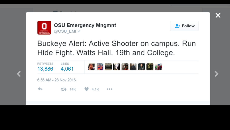 Ohio State University is on lockdown due to an active shooter on campus. The university has posted a statement for students to take shelter, "Run Hide Fight." and to avoid Watts Hall, 19th and College.