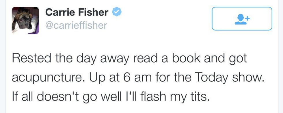 Personally, I think Fisher has gotten to a point in her life that anything goes, and we can bask in that attitude. I would recommend you check out her Twitter feed and enjoy what Twitter and Emojis were made for https://twitter.com/carrieffisher. She wrote an entire tweet in Emoji with her picture of her dog Gary which translates to: "I saw Daniel Craig when he was a stormtrooper. Great hat + abs." Honestly, I am building the best case here.
