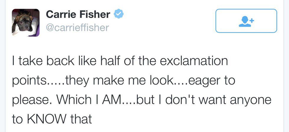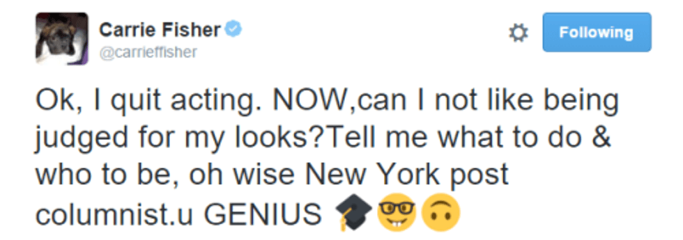 As a young woman in the middle of all kinds of changes in her life, finding guidance in contemporary pop culture can be difficult (not that anyone should be finding solace in pop culture idols anyhow). It just happens to be that Carrie Fisher exists and is an avid participant of Twitter and filled with all kinds of words of wisdom and Emoji's.