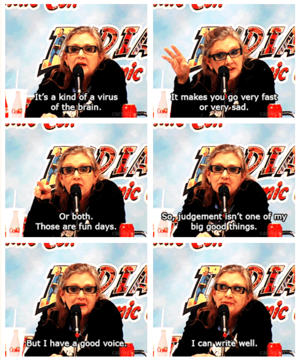 I think a lot of what she says and does speaks for itself. Carrie Fisher hasn't just reached fans of "Star Wars" films but an entire group of young women who relate to what she says and how she calls out bullshit in a satirical way. I could go on and on about how amazing she is, but I will leave you with these: