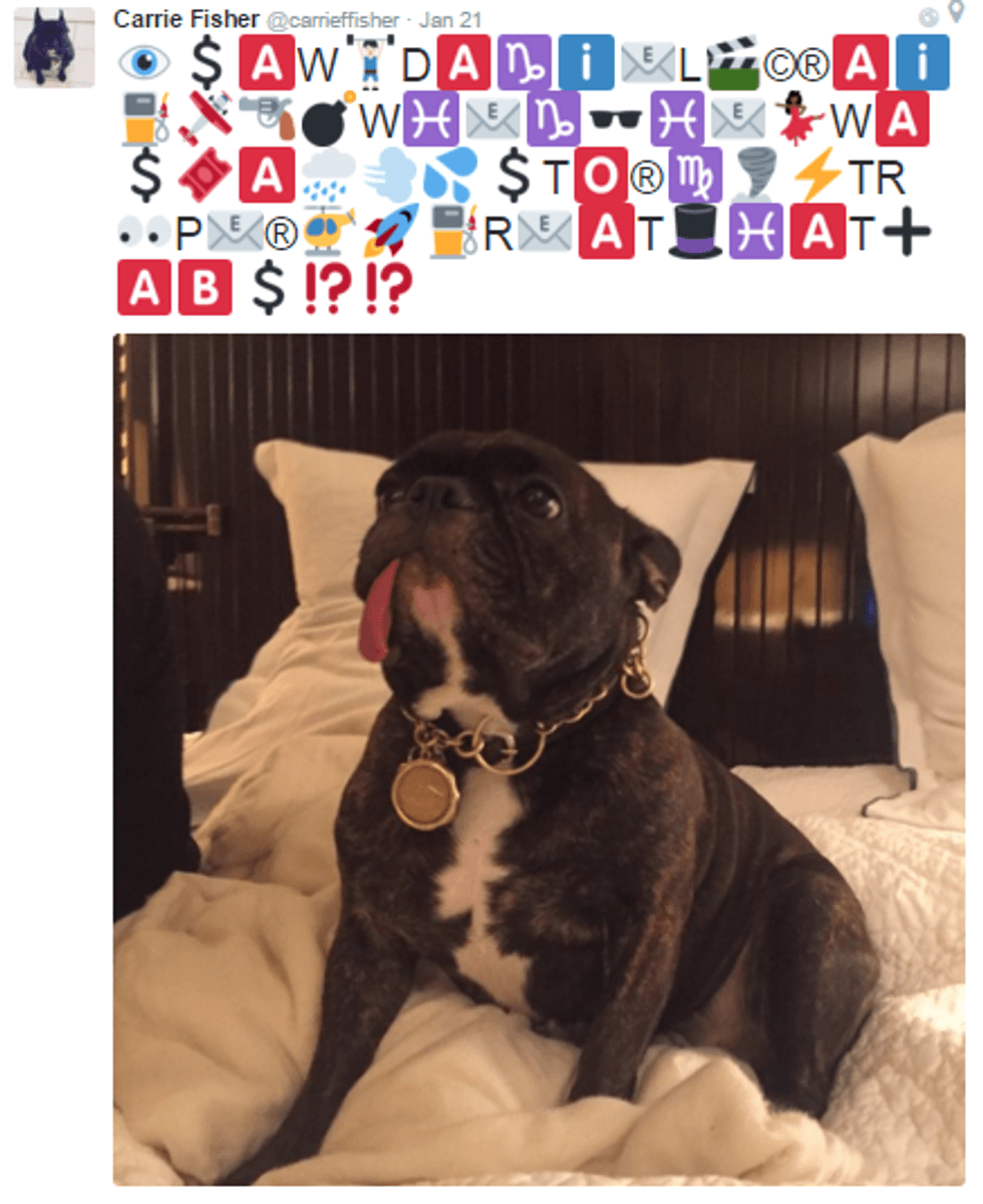 That is because the person I am talking about is Carrie Fisher. Although I have several women in my life that inspire me in everyday circumstances, it is always reassuring to know that someone like Carrie Fisher is out there Tweeting into the void. Tweeting away with as many Emojis as possible and with great wit.