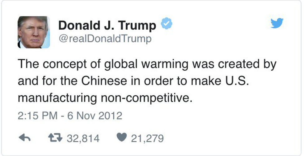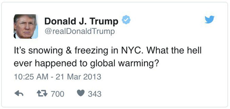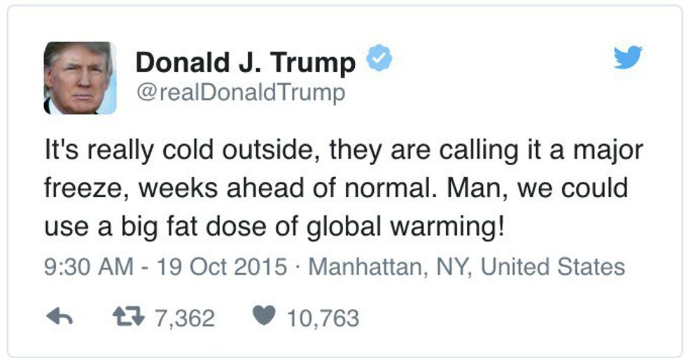 Just because one city or state has a colder than normal winter does not mean the global temperatures are not rising. Donald Trump has laughed and scoffed away any protestors about climate change. He has even attributed this 'conspiracy' to the Chinese.