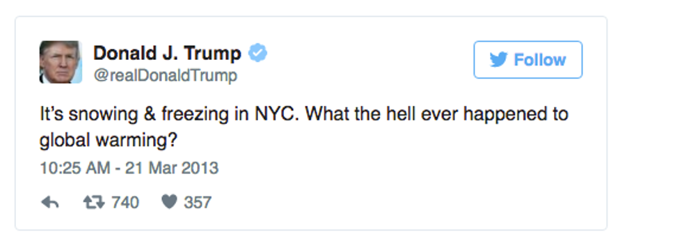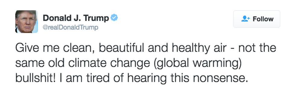 Well, his tweets say it all, don’t they? I mean, do I really need to elaborate? I’m not saying Clinton is exactly a climate warrior (at least she acknowledges that climate change is a real problem), just that it’s obvious who’s going to be less of a harm to the planet. That’s what this election is all about, right? The lesser of two evils.
