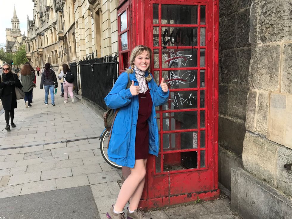 Posing by one of the famous red London telephone boxes in...Oxford.