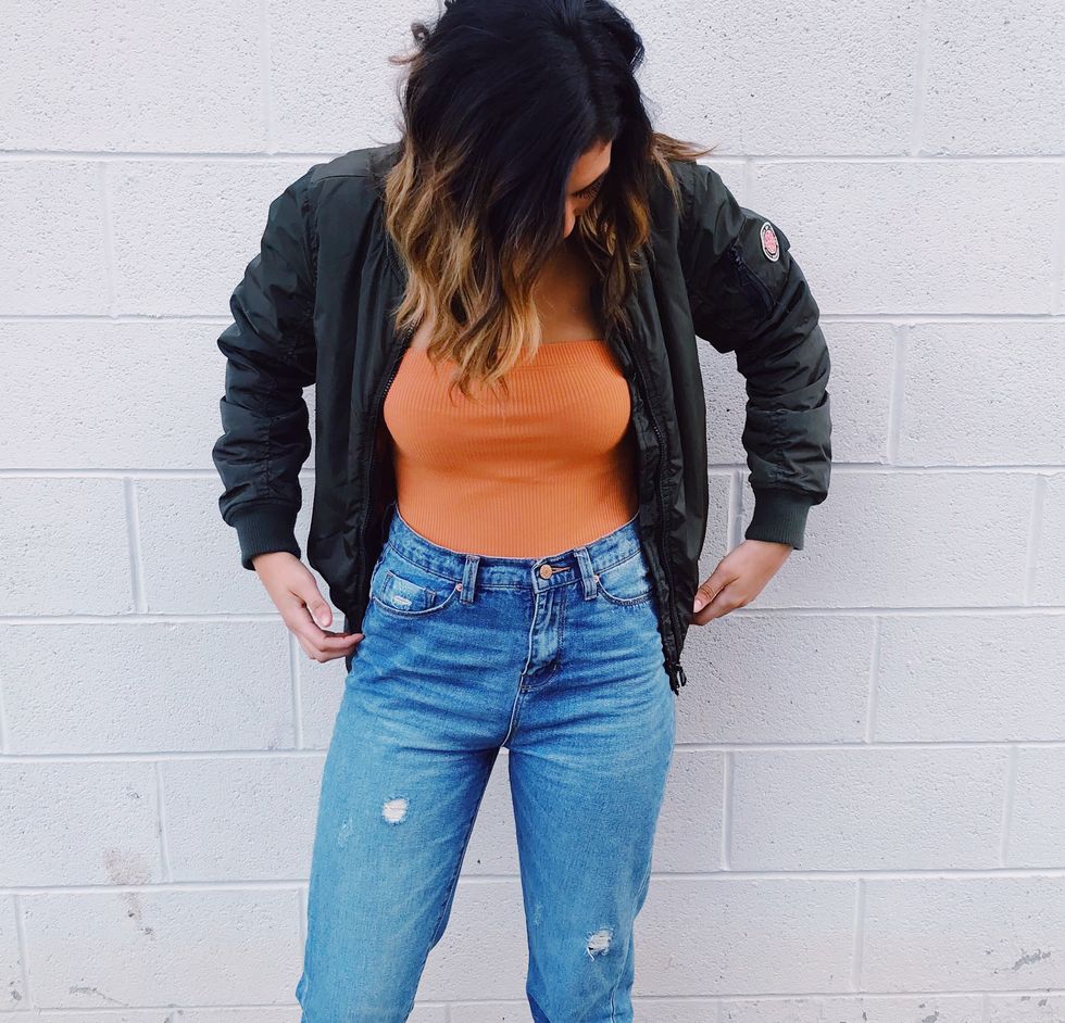 Outfit #4: Army green jacket with orange interior: Burlington Coat Factory, Orange bodysuit: Forever 21, High-waisted "Mom" jeans: Urban Outfitters