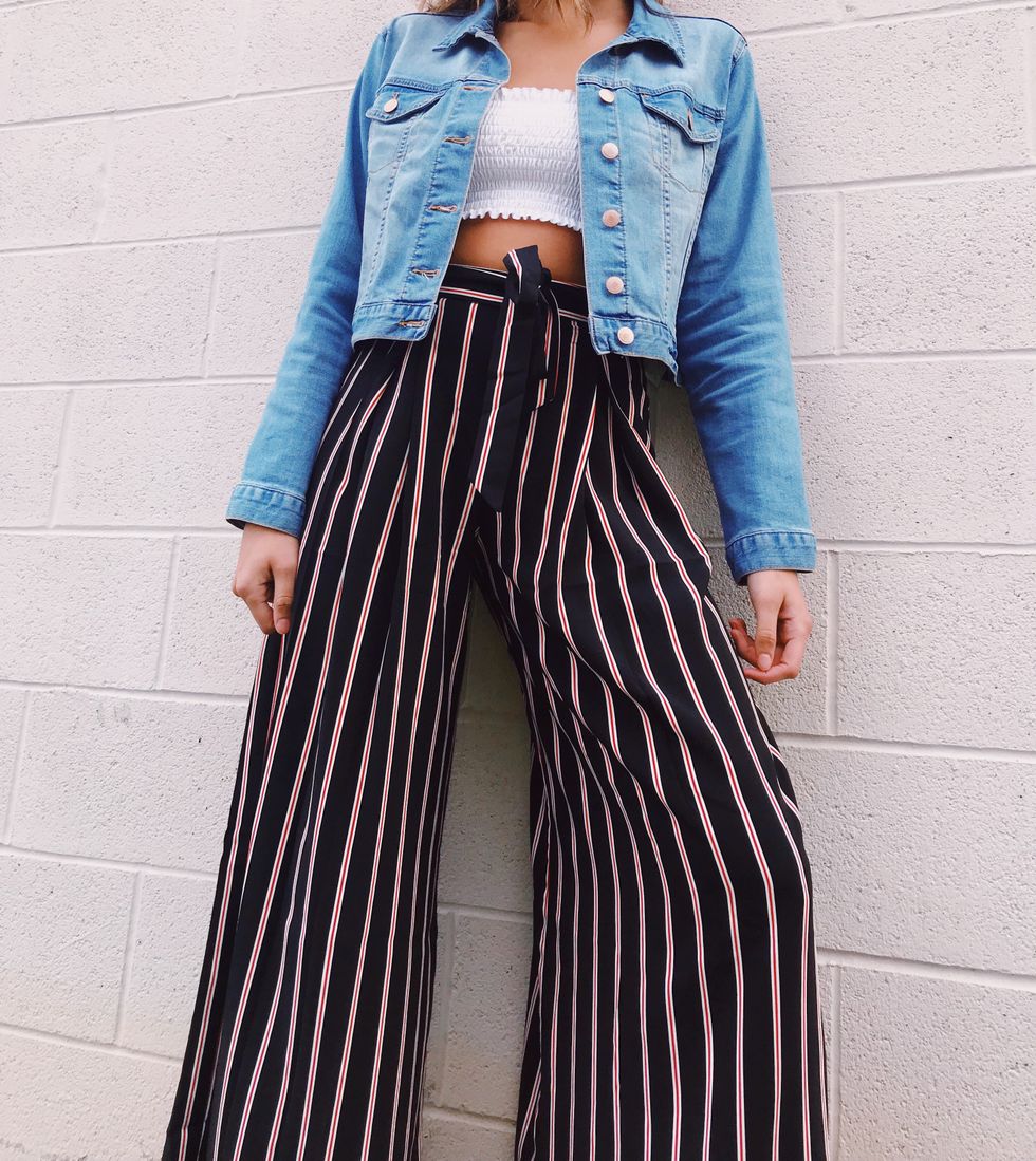 Outfit #9: Denim Jacket: Forever 21, White Bandeau top: Urban Outfitters, Striped high-waisted pants: Forever 21