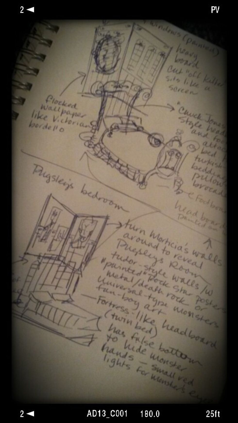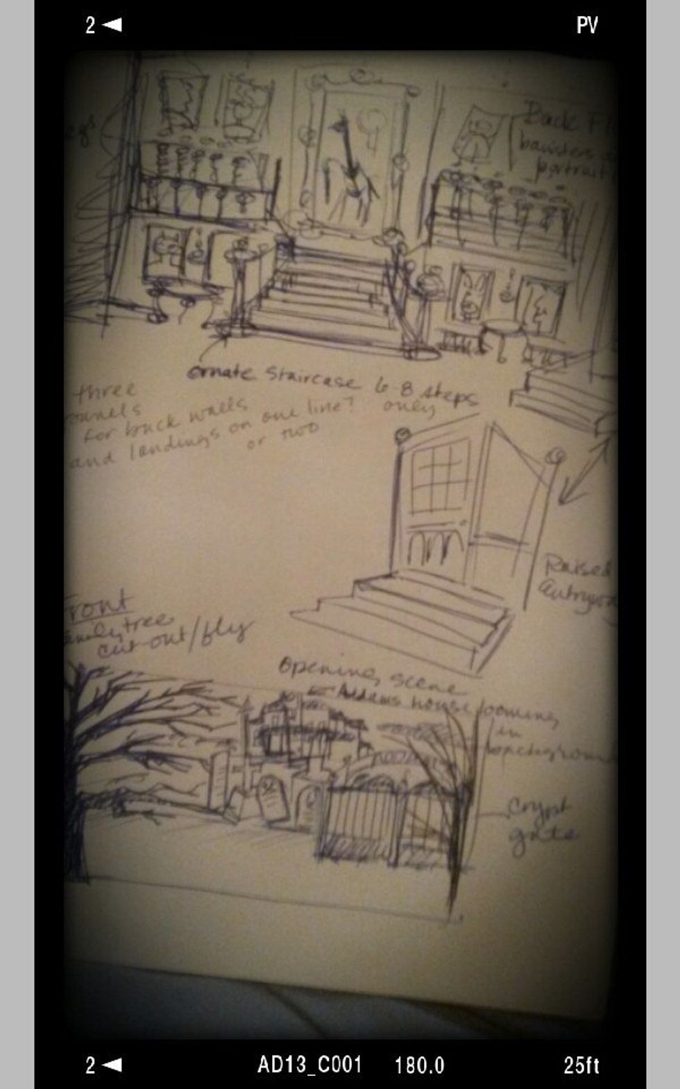 My first round of sketches are always quite rough and full of many notes, arrows and references. I turned these over to Ruth early last week. This week, I'm planning to start more detailed color sketches — picking out color samples and possible references for set pieces. We are having an "Addams' Family" meeting on Nov. 12 to generate interest in the production. Although, I'm pretty sure there are many who are interested in participating.
