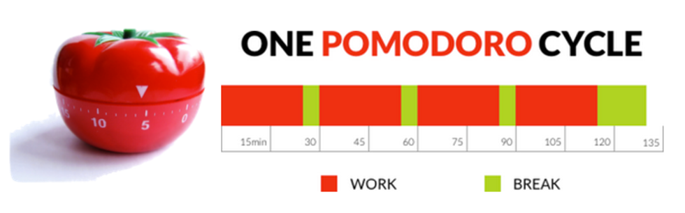 The Pomodoro technique is a productivity system where you set a series of sprints where you get as much work done as you can followed by a short break. Their recommended time is 25 minutes of work followed by 5 minutes of rest, then a twenty-minute break after four completed cycles.