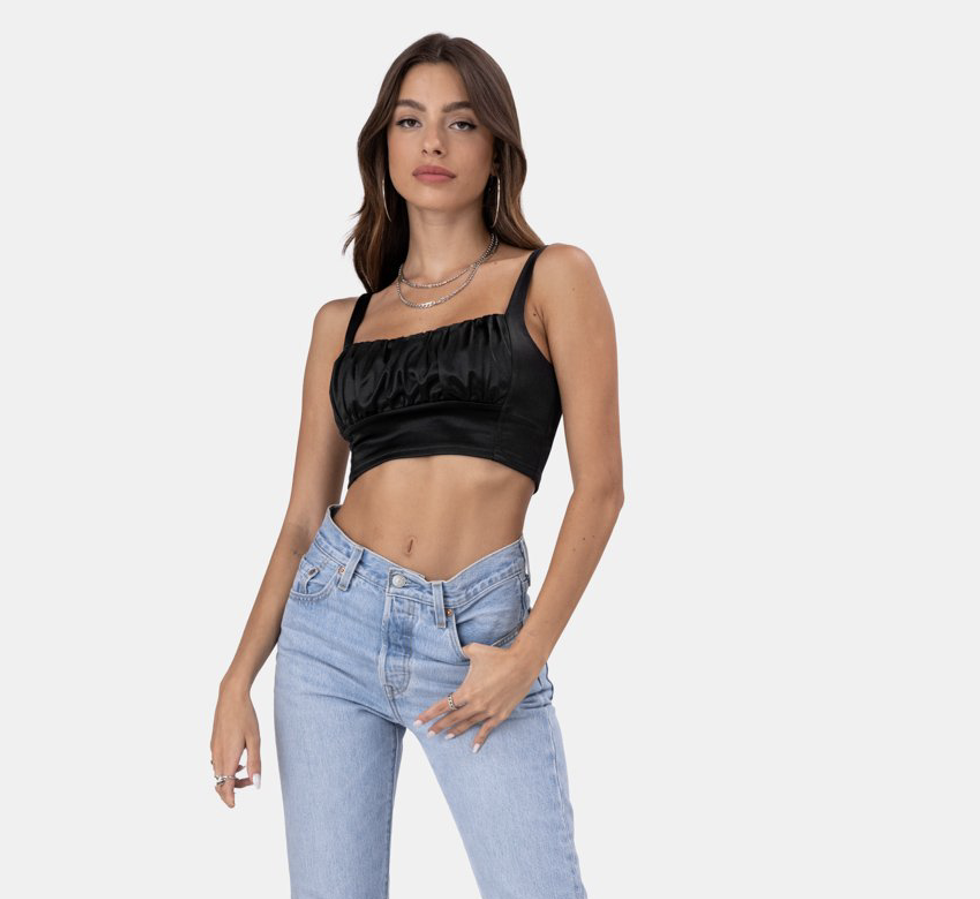 I have been in need of black crop tops, so I ordered this "Slick Satin Finish Crop Top." I was pretty confident a medium would fit because I always buy crop tops in a medium, but I was unfortunately mistaken. I could get away with wearing this top, but it definitely fits tighter than I expected. I still have yet to decide whether to keep it, exchange it for a large, or return it all together.