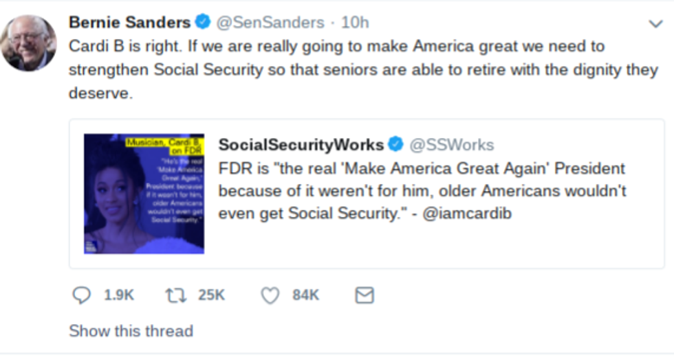 She takes to her social media platforms to speak on how we should better our country. On April 18, 2018 Senator Bernie Sanders tweeted how he agreed with Cardi B on Social Security.